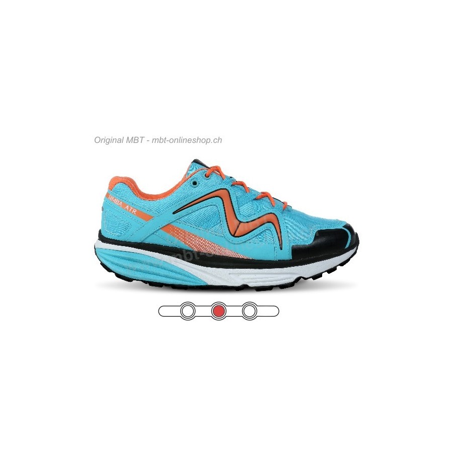 Auffällig schöner, leichter und bequemer Sportschuh aus Textil für die Herren. Farbe: Blau mit orangen Einsätzen. Kann auch gut als Halbschuh in der Freizeit getragen werden. Perfekte Passform. MBT-Index: Stufe 2