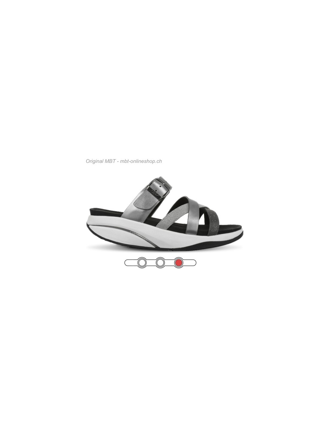 Schlüpfschuh-Sandale in der Farbe silber-grau metallic für Damen mit einem verstellbarem Riemen übers Rist.  Kann auch prima als Hausschuh verwendet werden. Gibt guten Halt. MBT-Index: Stufe 3
